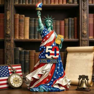 The Statue of Liberty is draped in a vibrant stars-and-stripes design, with a special “250” emblem marking the anniversary of the nation's founding in 1776. Detailed craftsmanship and vivid colors make this sculpture an eye-catching addition to any space.