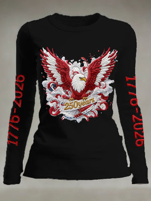 Women's casual long-sleeved T-shirt with 250th anniversary national flag and floral print.