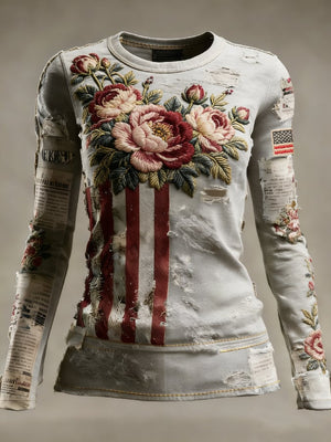 Women's casual long-sleeved T-shirt with 250th anniversary national flag and floral print.
